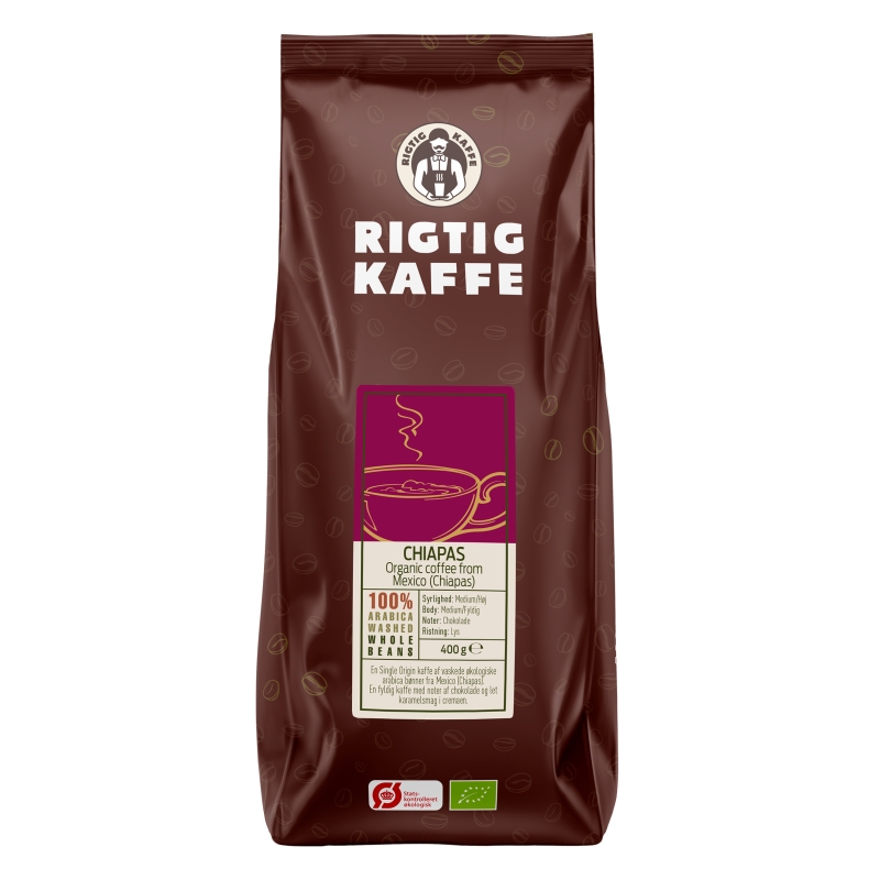Rigtig Kaffe Organic Chiapas är en mexikansk, ekologisk kaffeblandning med en medium body och en balanserad smak.