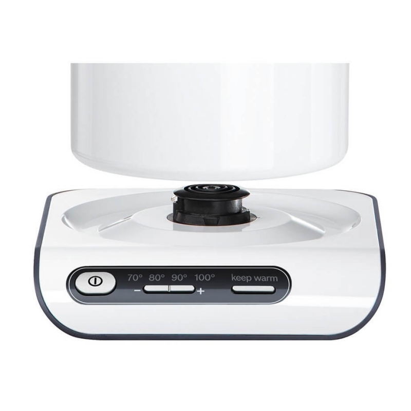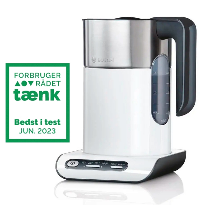 Fantastisk vattenkokare från tyska Bosch, som står på en 360 graders bas, där vattenkokaren kan ställas som du vill. Vattenkokaren styrs genom panelen på basen. Den inbyggda "Temperatur Control" gör att vattenkokaren kan värma vattnet till 70ºC, 80ºC, 90ºC eller 100ºC, allt efter vad du ska använda vattnet till. Funktionen "Keep Warm" håller vattnet varmt.