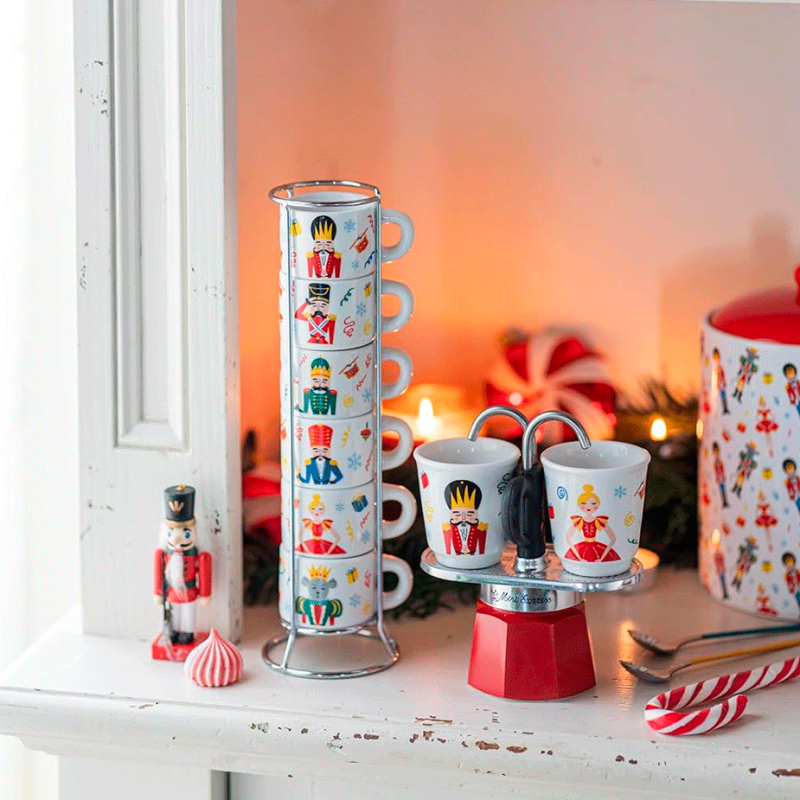Detta set med 6 espressokoppar från Bialetti är tillverkat i kraftigt porslin och pryds av de finaste motiven från Nötknäpparen. De är perfekta för att servera din nybryggda espresso och blir ett vackert inslag i köket när de står i sin hållare.