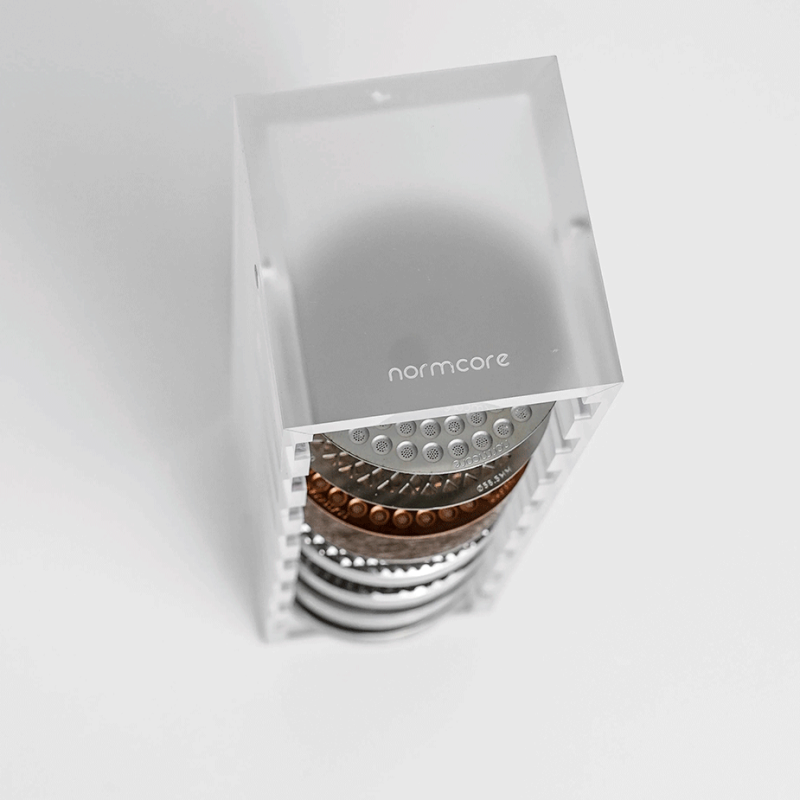 Håll ordning på dina Puck Screens med denna eleganta och funktionella hållare i frostat akryl från Normcore – perfekt för din baristastation.