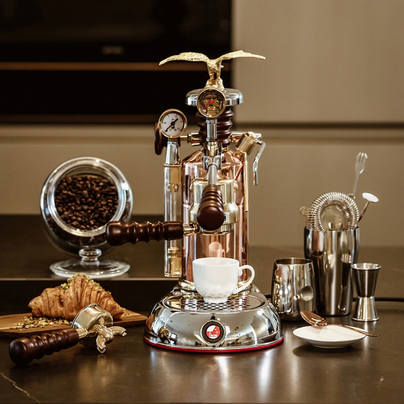 Maskinen är utrustad med den klassiska och välkända La Pavoni-örnen, som är placerad ovanpå locket till kedeln och ger maskinen ett exklusivt utseende.