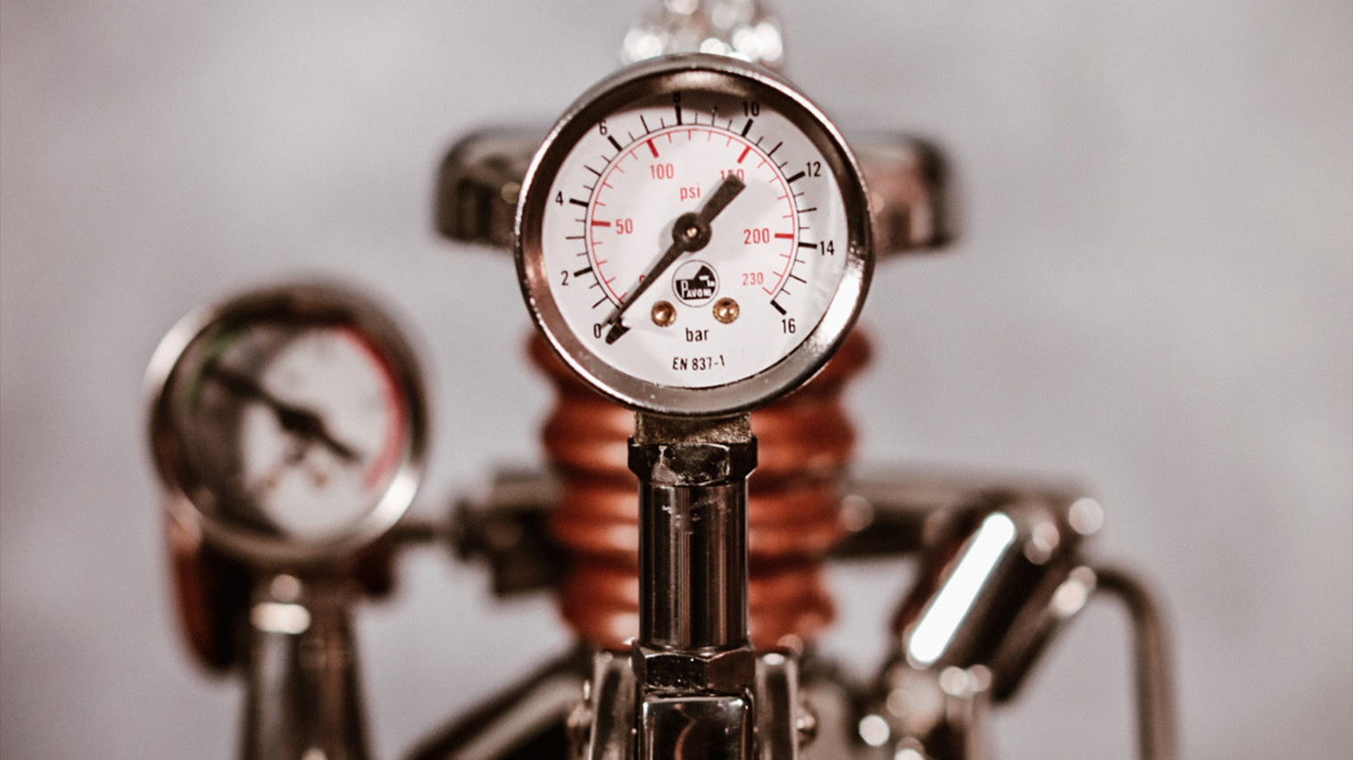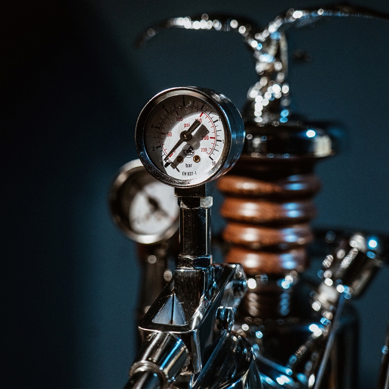 Maskinen är utrustad med en indikator för vattennivån i pannan samt en manometer som visar trycket i pannan, vilket indikerar när maskinen har nått rätt temperatur. Maskinen är klar för bryggning när temperaturindikatorn lyser och pilen på manometern är i den gröna zonen.