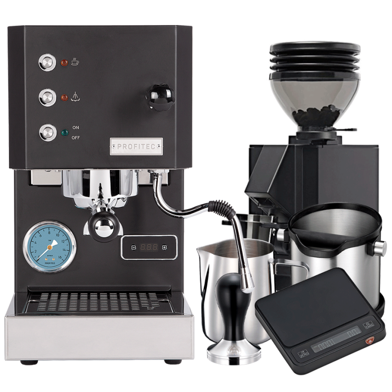 Tillbehör passar Profitec GO Matt Svart Espressomaskin Modell 2025 Inkl. Eureka Mignon Zero 55s Espressokvarn, Kaffevåg & Baristautrustning