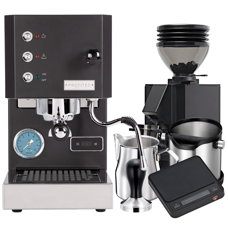 Tillbehör passar Profitec GO Matt Svart Espressomaskin Inkl. Eureka Mignon Zero 55s Espressokvarn, Kaffevåg & Baristautrustning