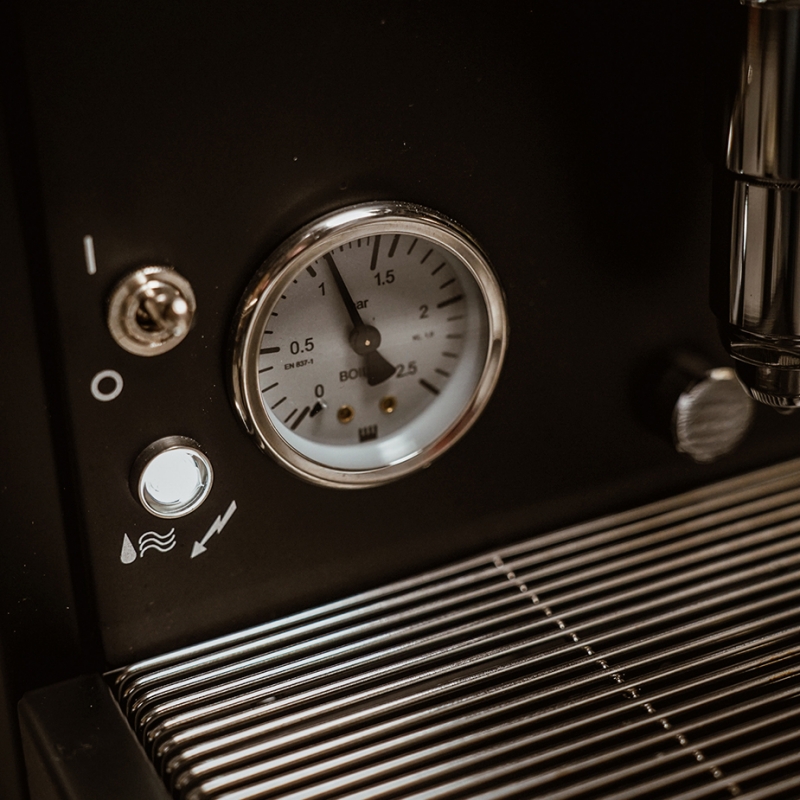Maskinen har även en manometer som visar trycket i kedeln och indikerar när kedeln har den optimala temperaturen och är klar att ånga mjölk.