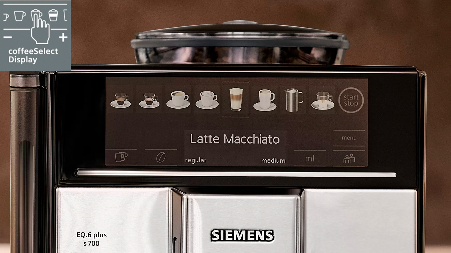 Siemens EQ6‑espressomaskinen har stor grafisk display med interaktiv meny som gör användningen enkel — en elegant och användarvänlig skärm.