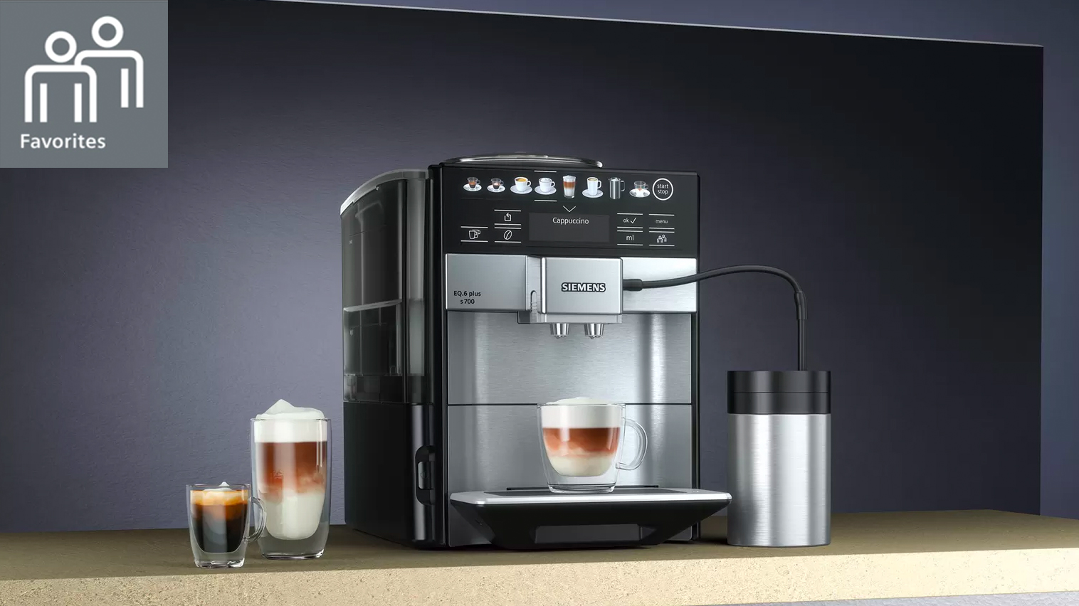 Siemens EQ6‑espressomaskinen är enkel att underhålla och ger själv besked när den ska rengöras, avkalkas eller ha filterbyte.