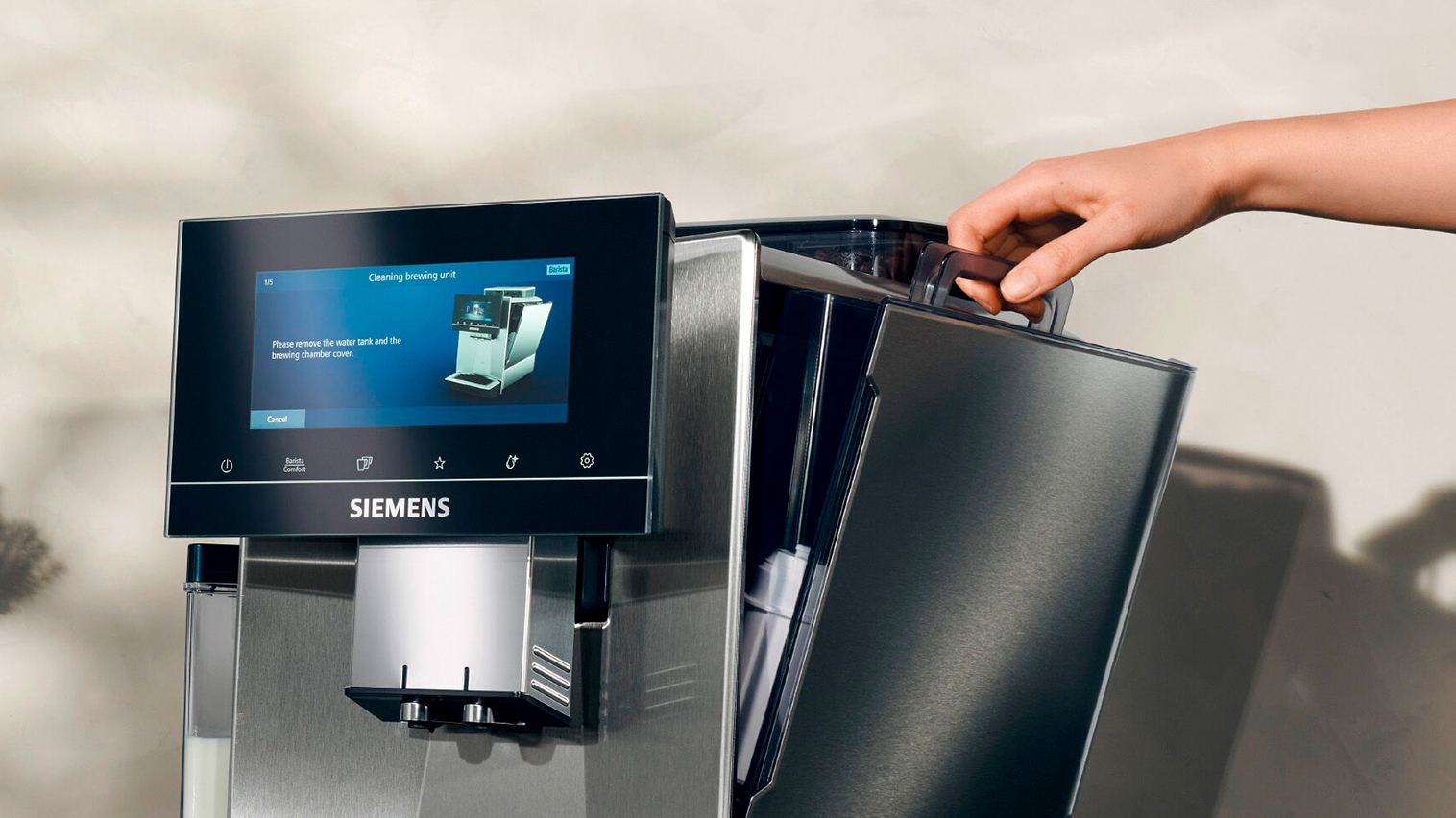 Siemens EQ900 espressomaskin är enkel att underhålla och meddelar själv när den behöver rengöras, avkalkas eller få nytt filter.