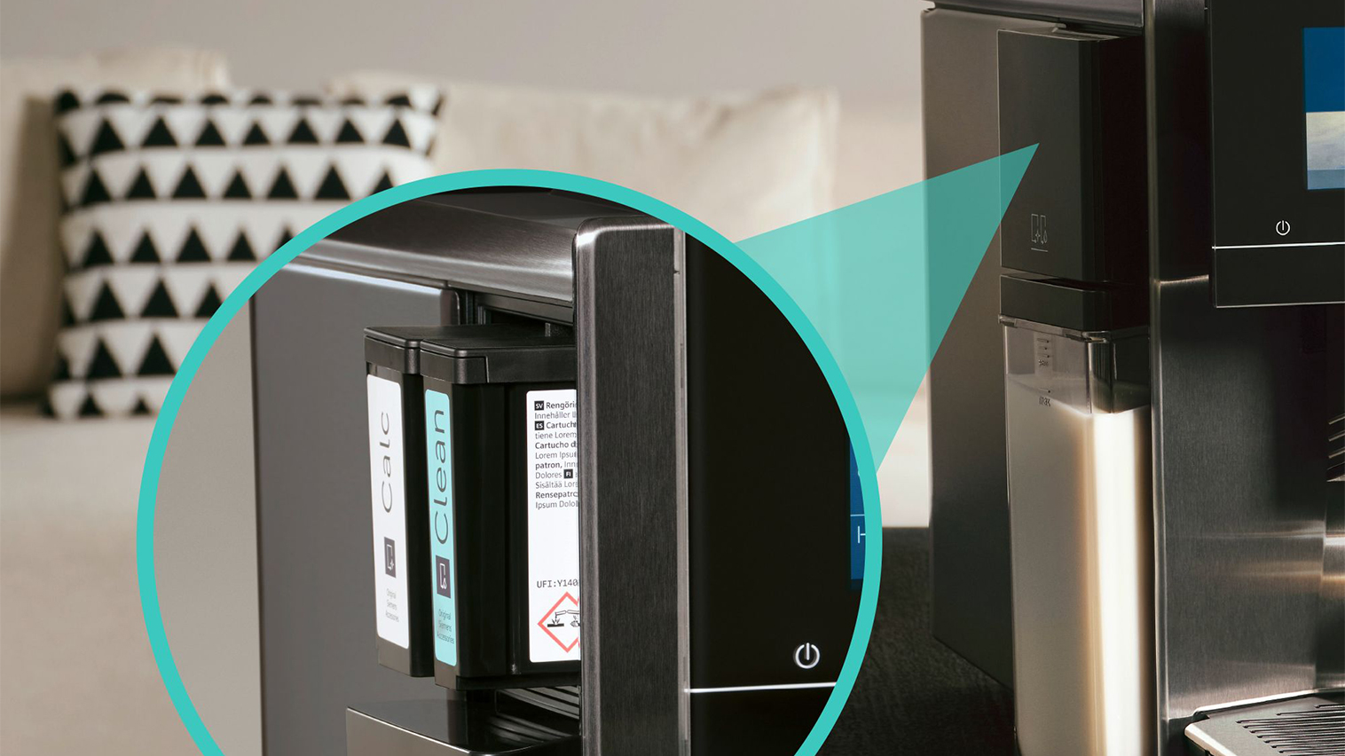 TQ905RZ5 EQ900 är utrustad med autoCalc’n Clean, som består av automatisk rengöring och avkalkning med inbyggda behållare i maskinen. Detta system ger maximal bekvämlighet, där maskinen själv ser till att både rengöra och avkalka. Maskinen meddelar när rengöring eller avkalkning ska utföras, eller när patronerna behöver bytas.