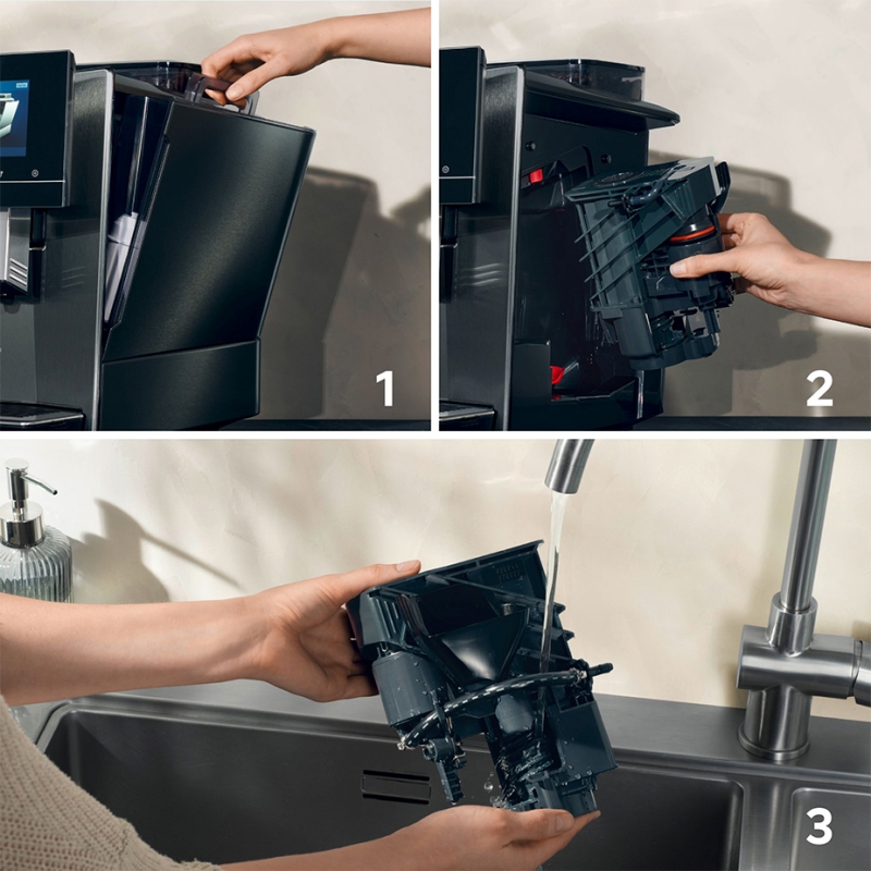För hygienisk rengöring av bryggeenheten – den är lätt att ta ut, skölja under vattenkranen och sätta tillbaka igen. Detta säkerställer fortsatt god smak och förlänger maskinens livslängd. Så kan du njuta av den rena aromen i det finaste kaffet.