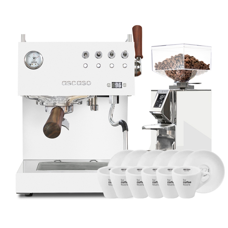 Ascaso Steel Duo Plus White Espressomaskin inkl. Eureka Mignon Libra Krom/Vit Kaffekvarn & Cappuccinokoppar