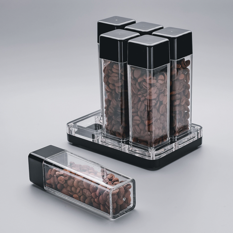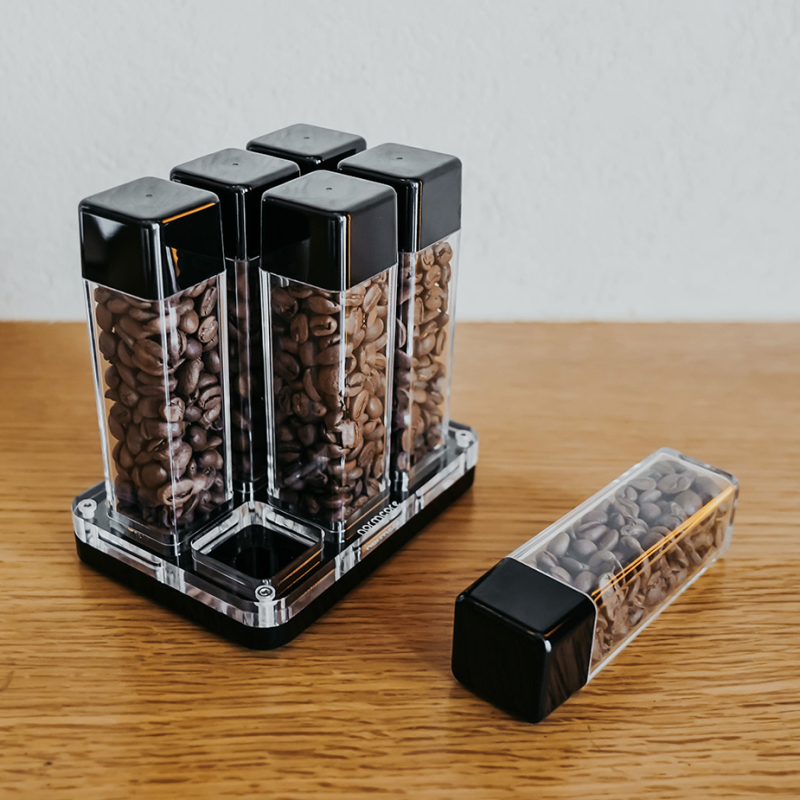 Normcore kaffebehållare set med 6 mindre glasbehållare erbjuder en innovativ lösning för förvaring av dina kaffebönor, designad för att bevara färskheten och optimera din bryggupplevelse.