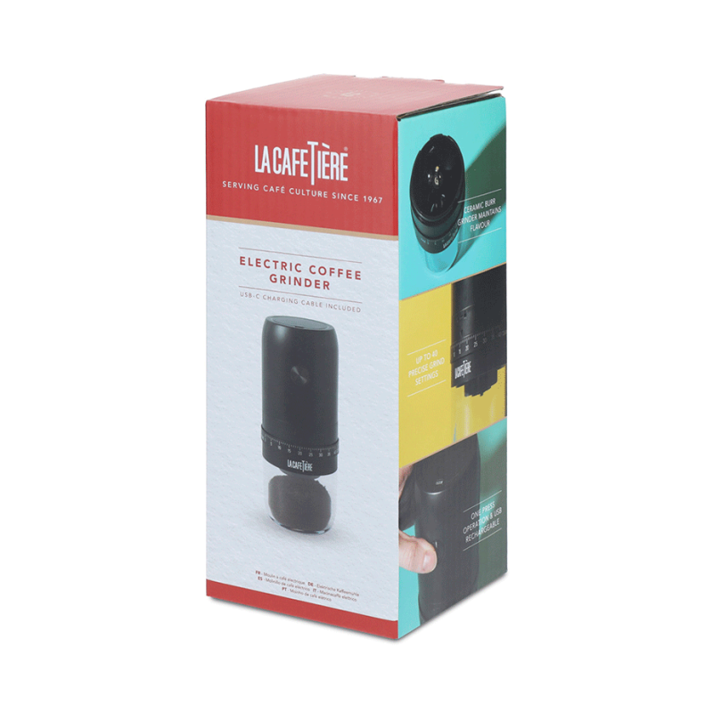 Upplev friheten med nymalet kaffe överallt med La Cafetière elektrisk keramisk kaffekvarn. Den kompakta och uppladdningsbara kvarnen erbjuder exakt kontroll med 40 inställningar – från fin espresso till grov presskanna – perfekt både i köket och på äventyr.