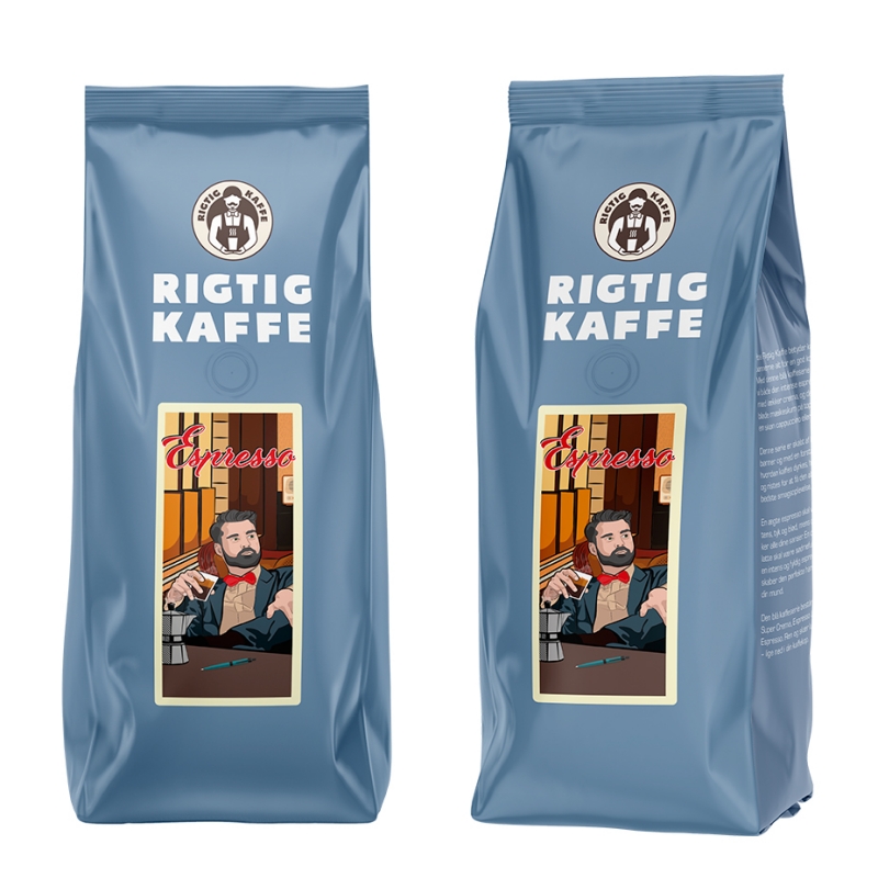 Rigtig Kaffe Espresso är en harmonisk och kraftig kaffeblandning, bestående av 7% arabica och 30% robusta från Brasilien, Indien och Vietnam.