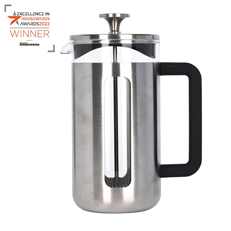 Presskannan är tillverkad av borosilikatglas och rostfritt stål, vilket gör den mycket hållbar. Dessutom förblir handtaget svalt, vilket gör den enkel att hantera.
