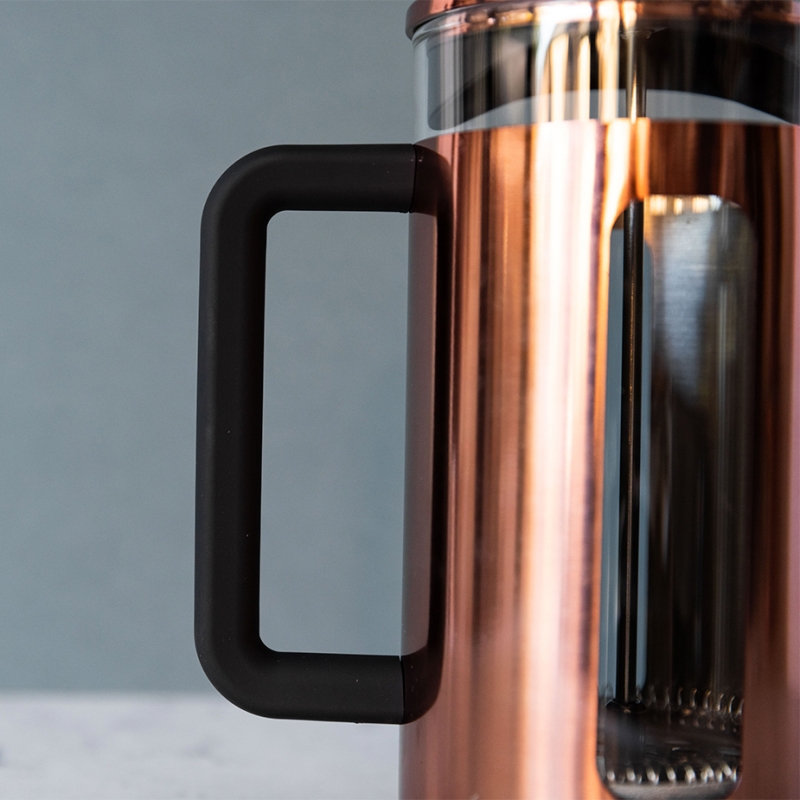 Presskannan är tillverkad av borosilikatglas och rostfritt stål, vilket gör den mycket hållbar. Dessutom förblir handtaget svalt, vilket gör den enkel att hantera.