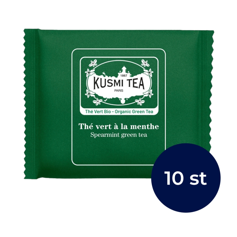 Kusmi Grönt Te Spearmint är ett ekologiskt kinesiskt grönt myntate smaksatt med Gunpowder-te, som är rikt på antioxidanter samt vitamin C och E. I denna förpackning får du 10 tepåsar.