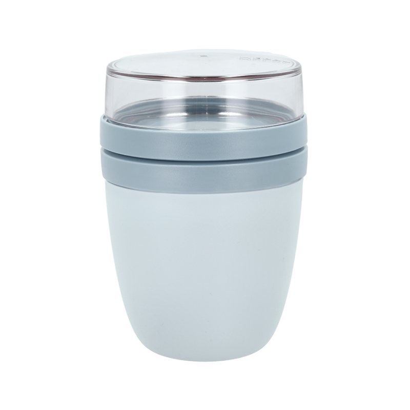 Muggen består av två behållare med separata lock, så olika livsmedel hålls åtskilda tills de ska ätas och kanske blandas.