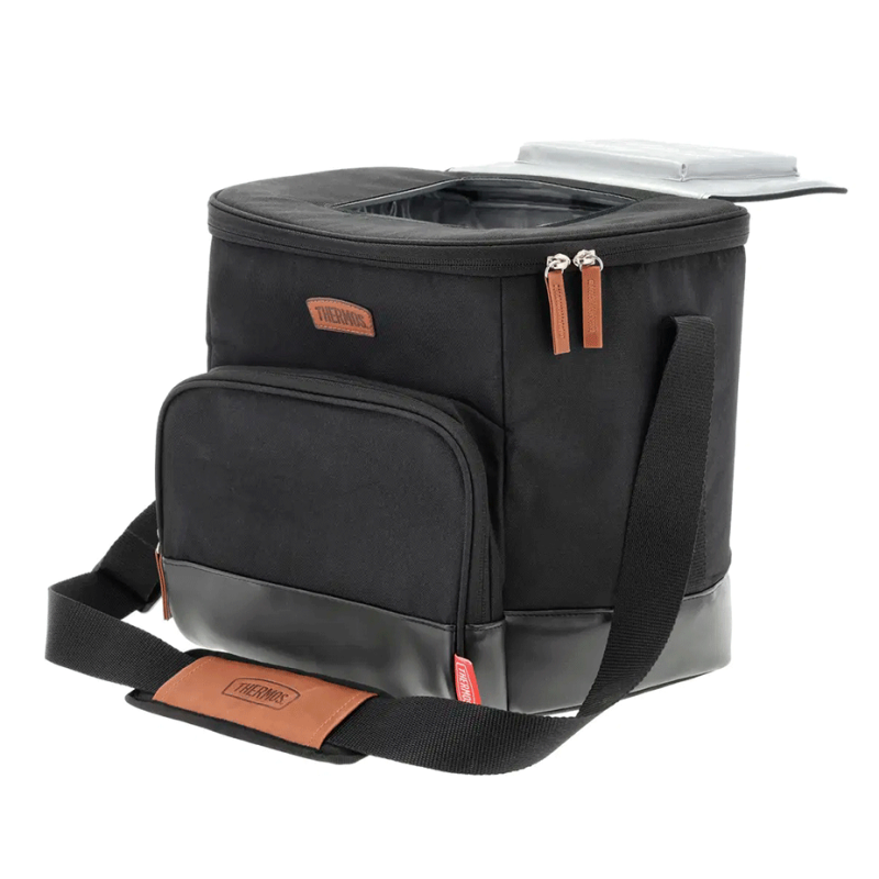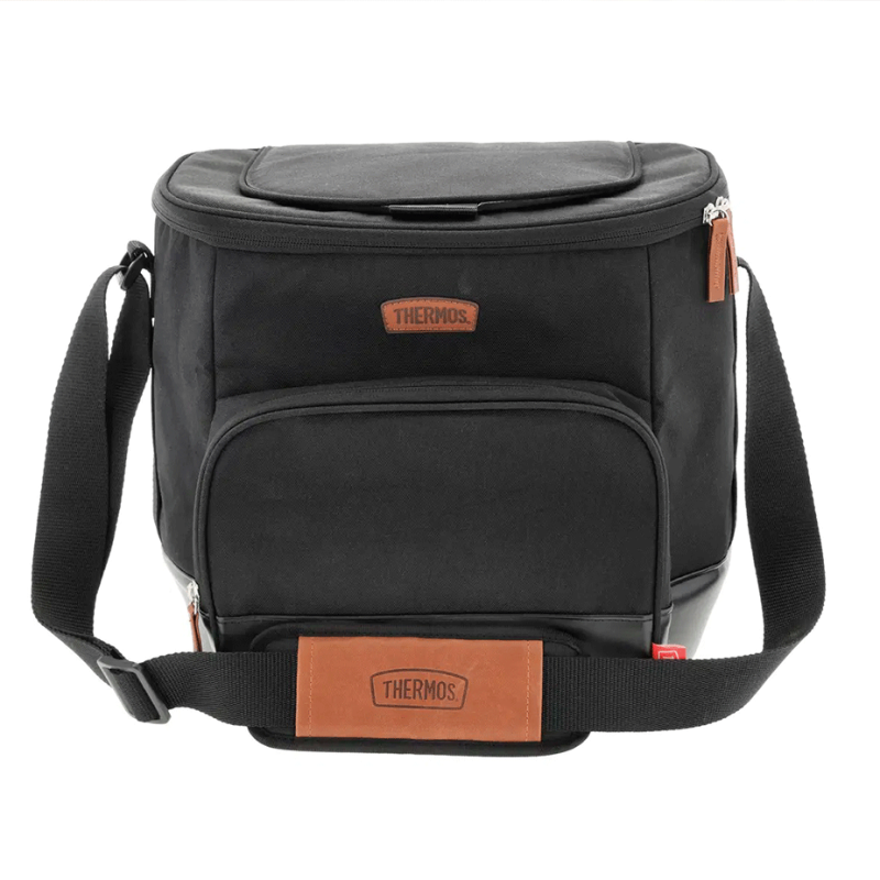 Den här kylväskan från Thermos har en stilren design i svart slitstarkt tyg med bruna läderdetaljer och plats för upp till 24 burkar.