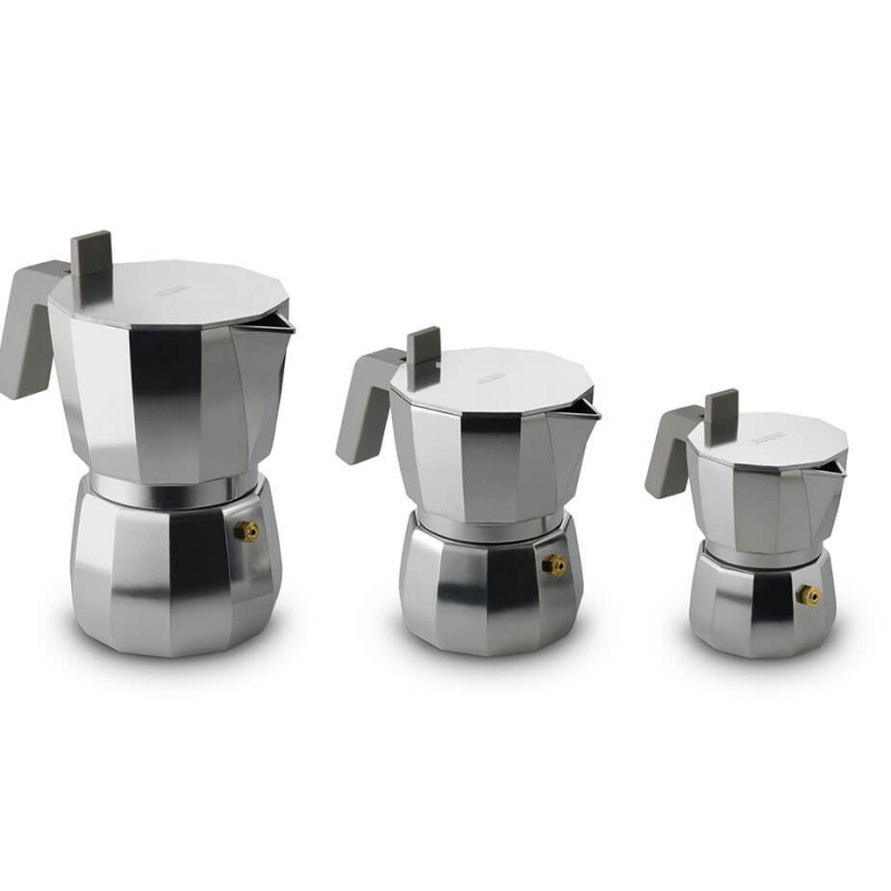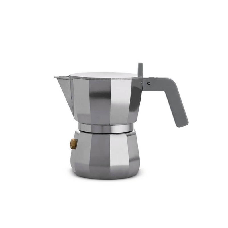 Espressokannan är utförd i aluminium och har ett grått plasthandtag. Moka-kannan är designad av arkitekten David Chipperfied och är en hyllning till Italiens åttkantiga espressokanna och dess uppfinnare, Alfonso Bialetti.