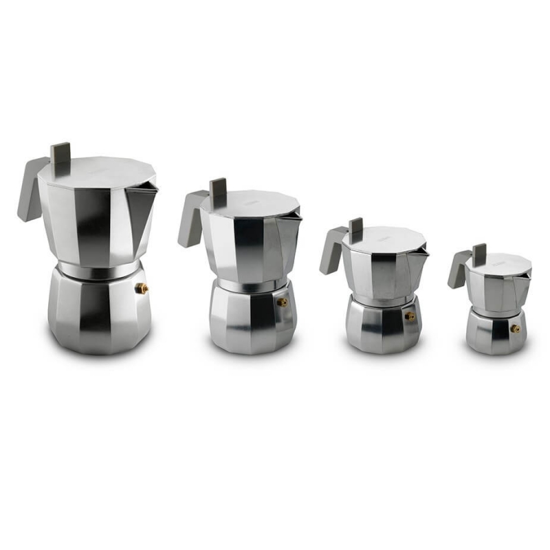Espressokannan är utförd i aluminium och har ett grått plasthandtag. Moka-kannan är designad av arkitekten David Chipperfied och är en hyllning till Italiens åttkantiga espressokanna och dess uppfinnare, Alfonso Bialetti.