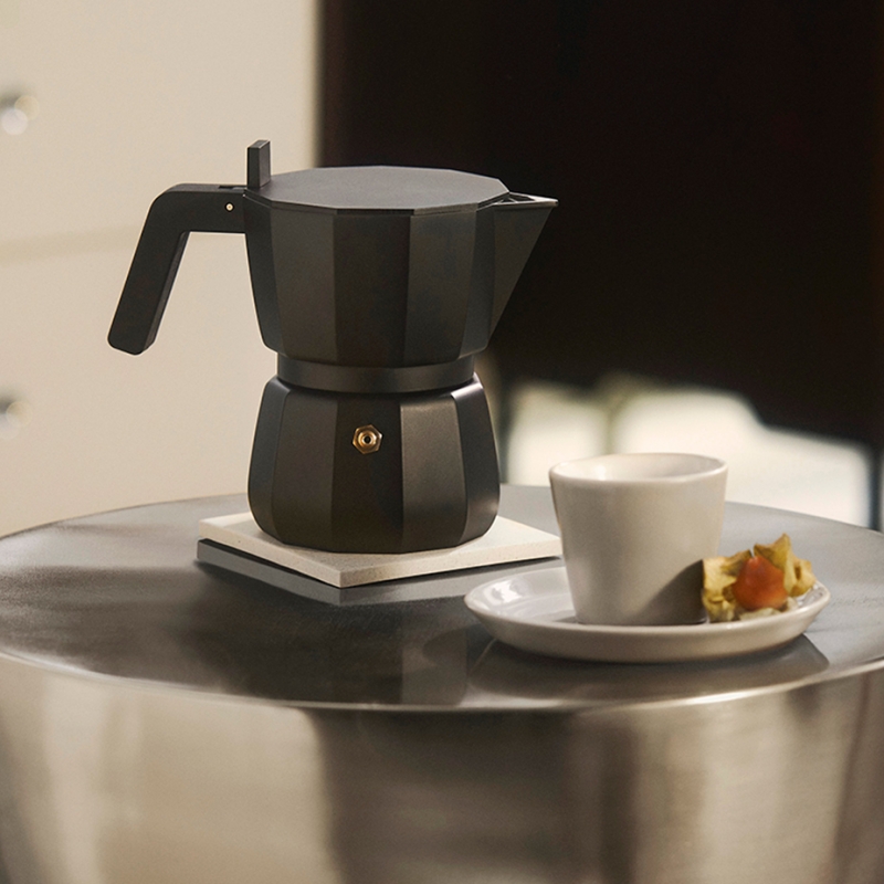 Espressokannan är tillverkad i svart aluminium med en matt finish och har en geometrisk form. Moka-kannan är designad av arkitekten David Chipperfield och är en hyllning till Italiens ikoniska, åttakantiga espressokanna och dess uppfinnare, Alfonso Bialetti.