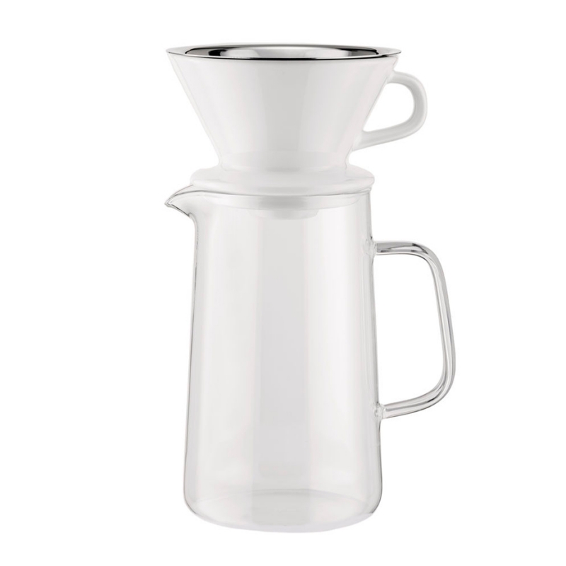Sättet består av en kanna i värmebeständigt glas, filterhållare i porslin och nätfilter i 18/10 rostfritt stål.