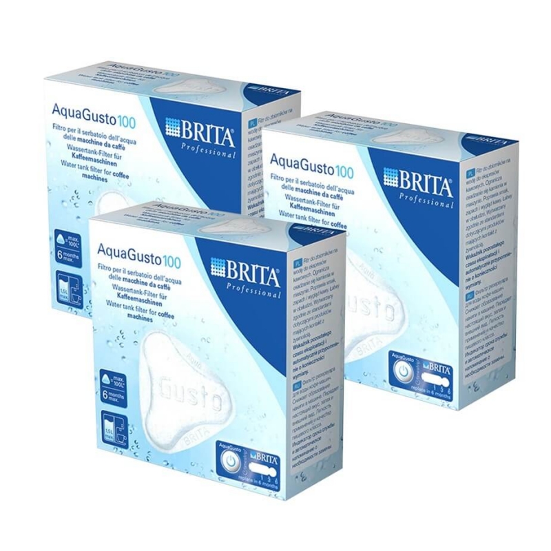 Brita AquaGusto 100 ska sköljas genom med vatten innan det läggs i vattentanken. Det rekommenderas att du gör det i god tid innan espressomaskinen/kaffebryggaren ska användas, t.ex. på kvällen, eftersom filtret ska hinna börja ta upp kalk från vattnet.