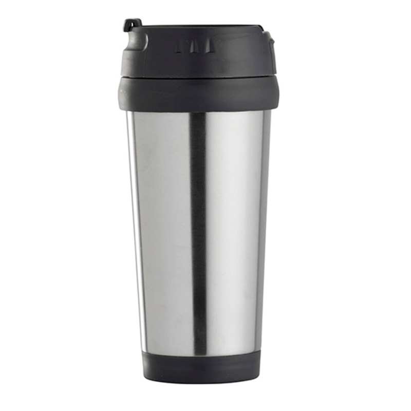Snygg termosmugg i rostfritt stål med lock som gör det enkelt att njuta av dina drycker på språng.