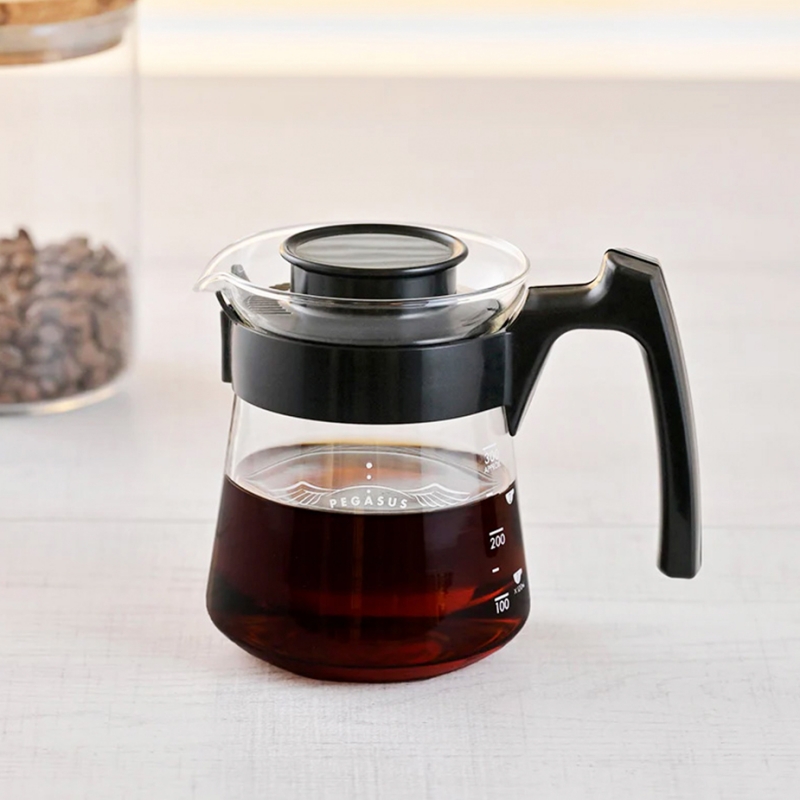 Hario Pegasus 01 Server är tillverkad av värmeresistent glas av högsta kvalitet och utrustad med ett lättanvänt lock och ett elegant handtag i svart plast.