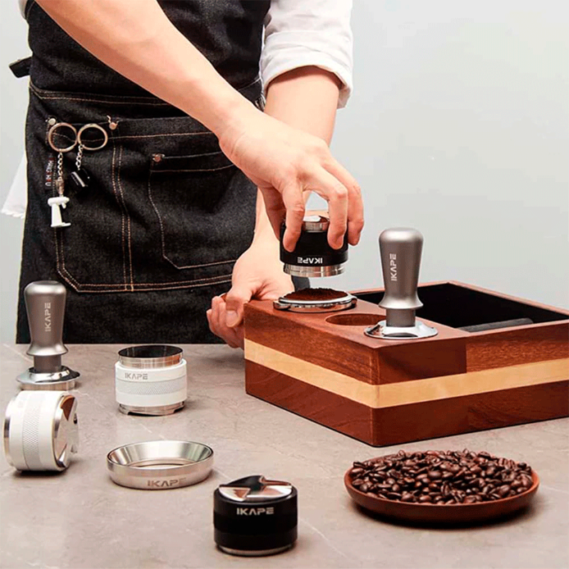 IKAPE-tampern har en platt botten och en diameter på 58 mm, vilket innebär att den passar filterkorgar med en diameter på 58 mm.