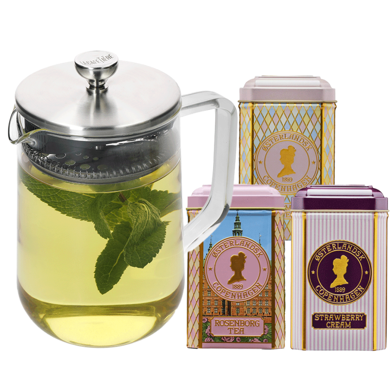 La Cafetière tebryggare är en ytterst elegant och modern tebryggare som gör det enkelt att brygga en härlig kanna te. I detta paket ingår 3 olika varianter av Østerlandsk Thehus pyramidtebrev.