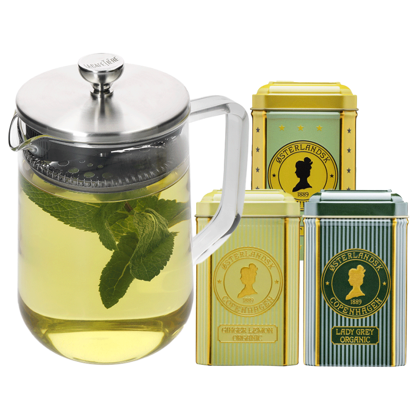 La Cafetière tebryggare är en ytterst elegant och modern tebryggare som gör det enkelt att brygga en härlig kanna te. I detta paket ingår 3 olika varianter av Østerlandsk Thehus pyramidtebrev.