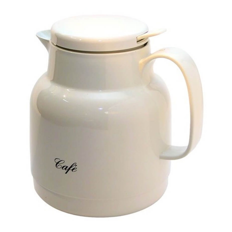 Termokanna till kaffe där det står "Cafe" på sidan. Termokannan är gjord i kraftig plast och försedd med en glasinsats, så kaffet kan hålla sig varmt.