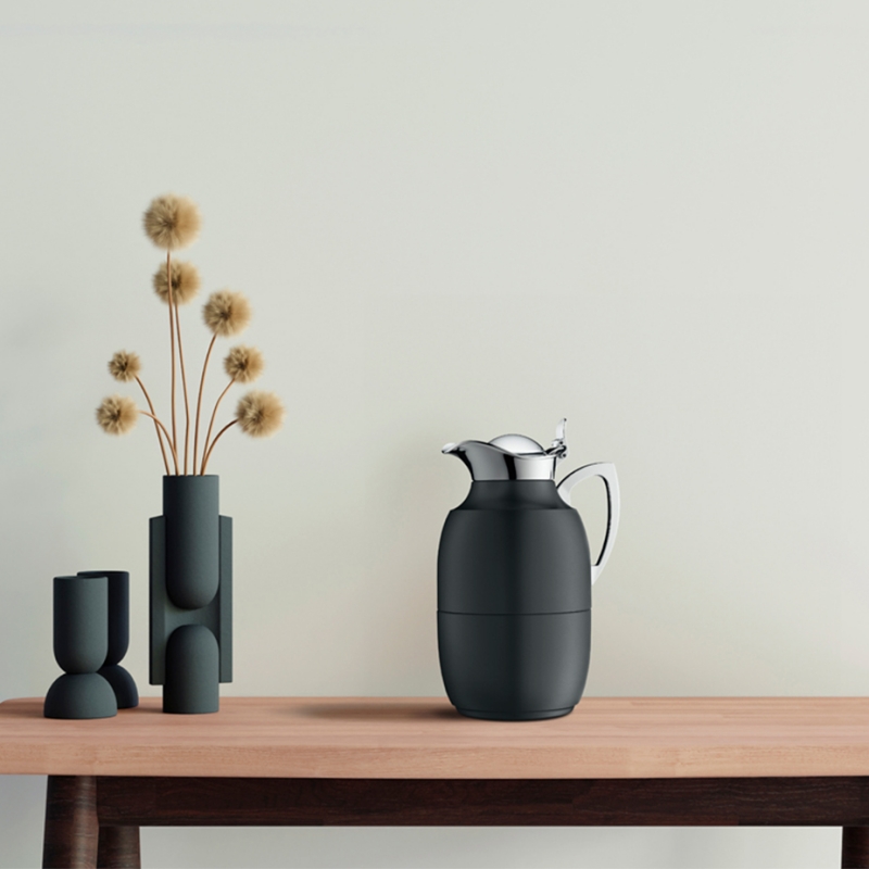 Alfi Juwel är en vacker och robust termoskanna i en exklusiv matt svart färg. Kannan är tillverkad av högkvalitativt, polerat rostfritt stål och kan användas med en hand.