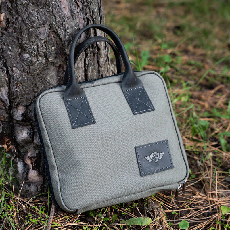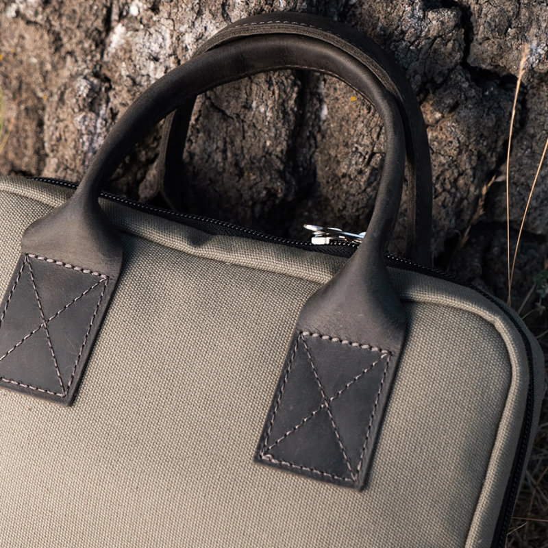 Väskan är handgjord i slitstark bomullscanvas med vadderade yttersidor, så din kaffekvarn och ditt bryggutrustning förvaras tryggt.
