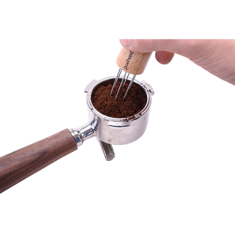 Nålarna i verktyget bryter upp klumparna i portafiltret jämnt före komprimering. Detta resulterar i korrekt extrahering, förhindrar kanalisering och gör dina espressoshots mer enhetliga.